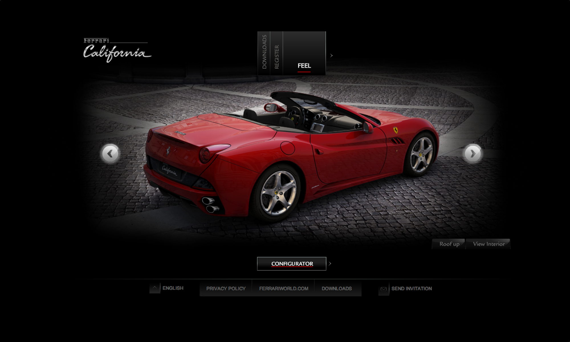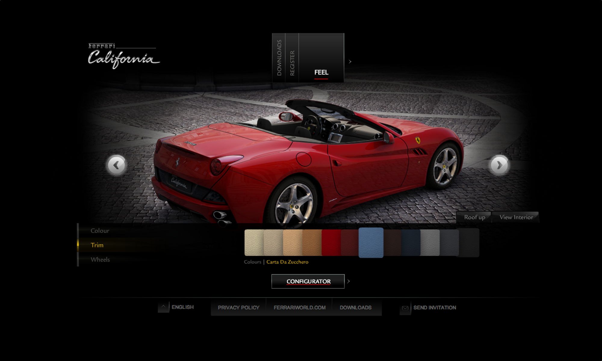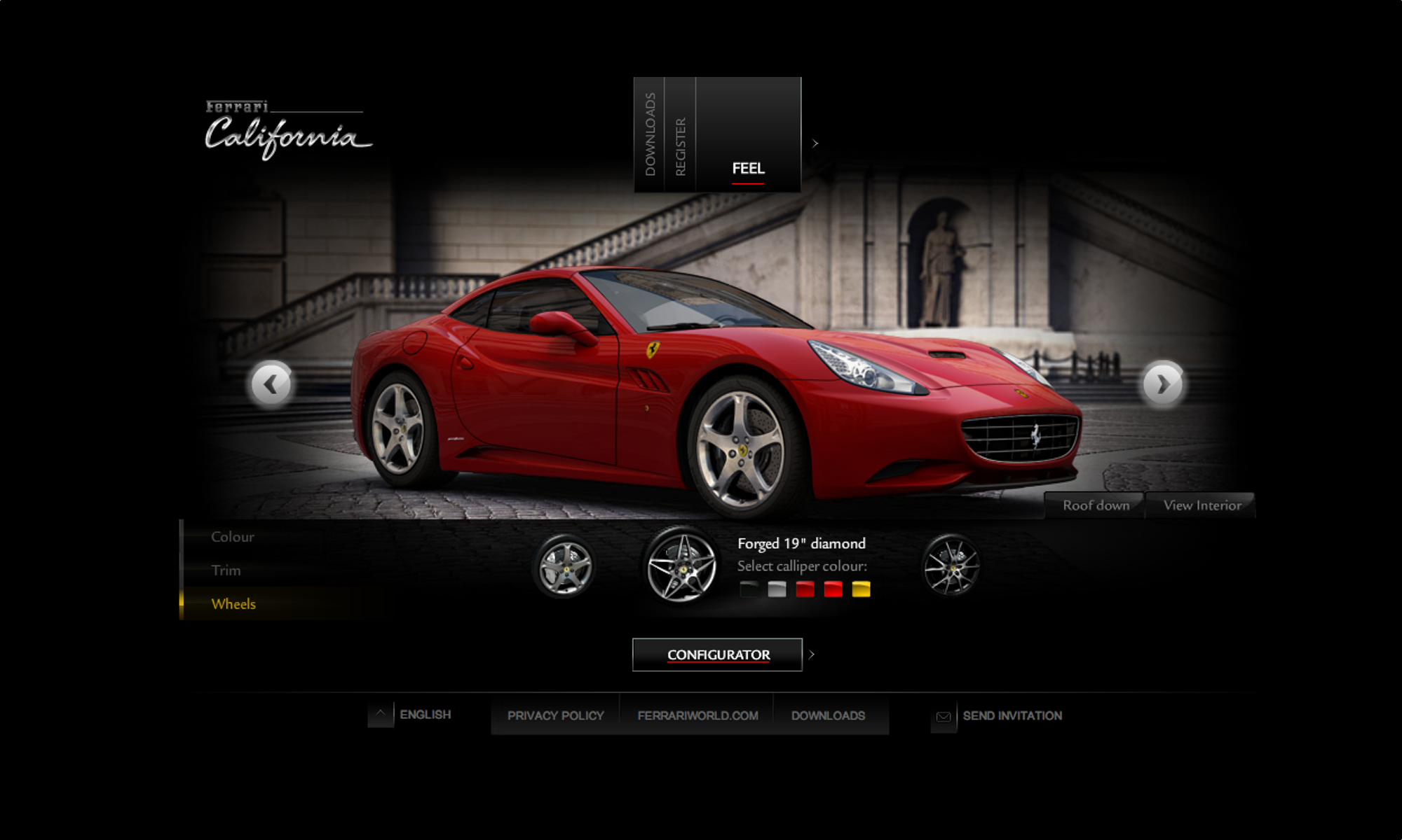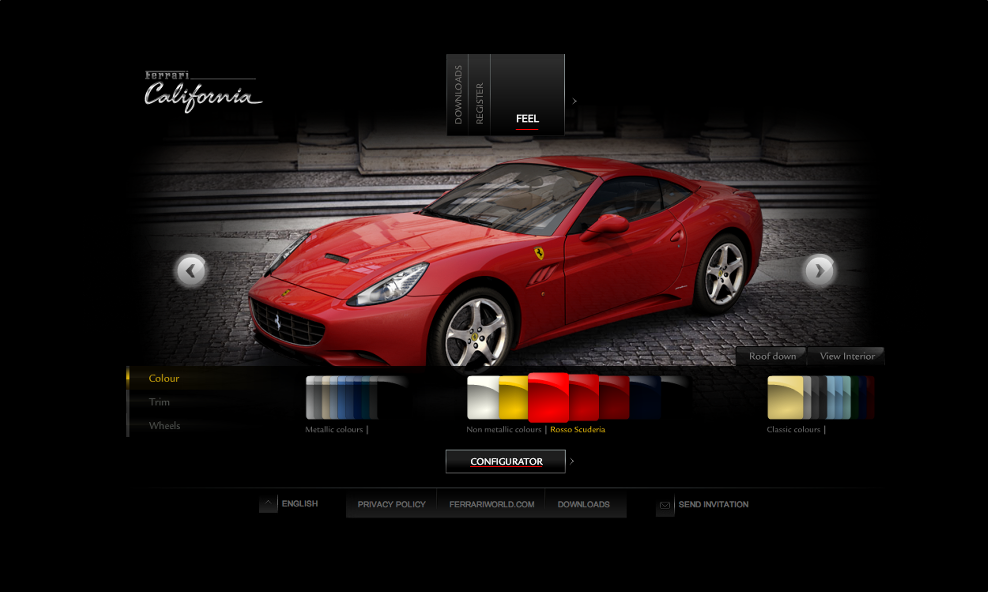 Ferrari California car configurator. Using dynamic 3D renderings for stunning visuals of the car combined with slick color and component transitions for an immersive interactive experience that is far more than just a pretty picture. Lunched with huge fan fair with a countdown site teaser this was one of many car configurator projects to come.