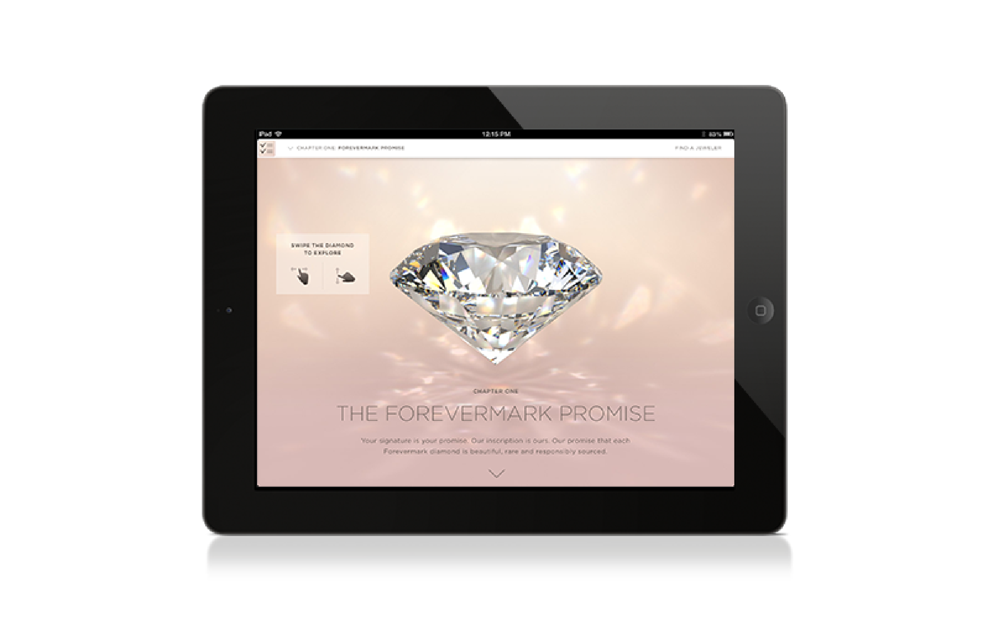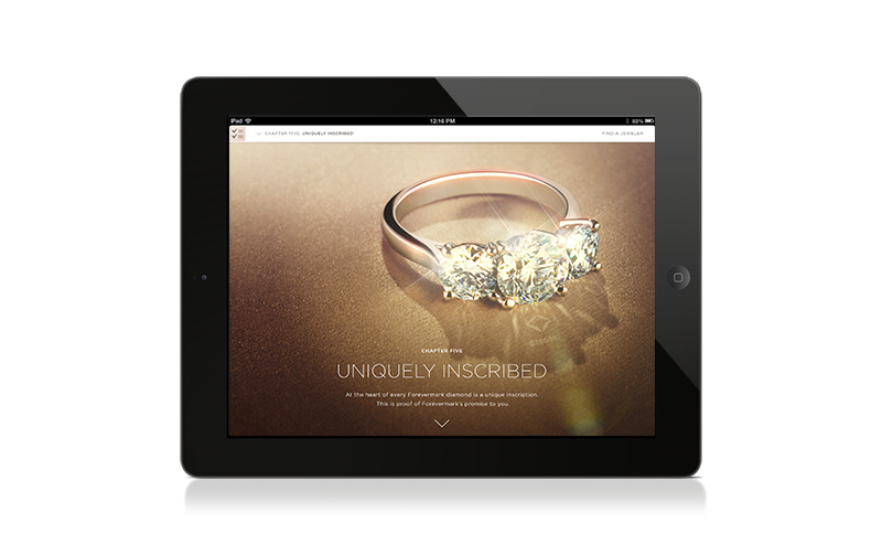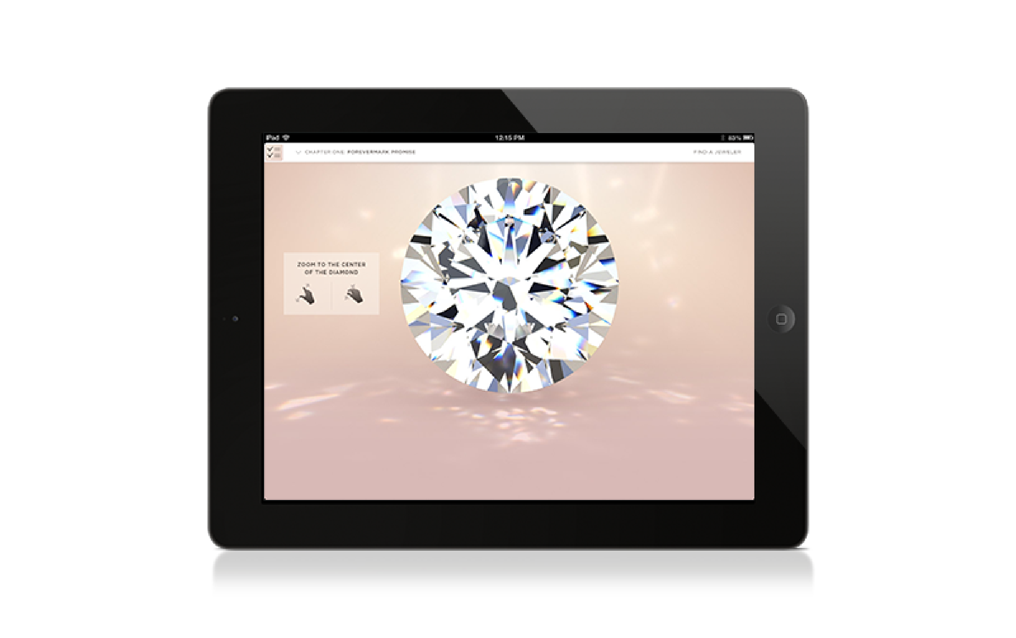 iPad application showcasing luxury diamonds from DeBeers. Using an interactive 3D rendering of a diamond. A lot of research involved to make the 3D interactive element with the diamond possible.