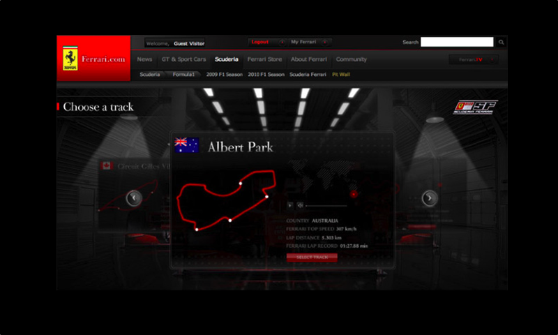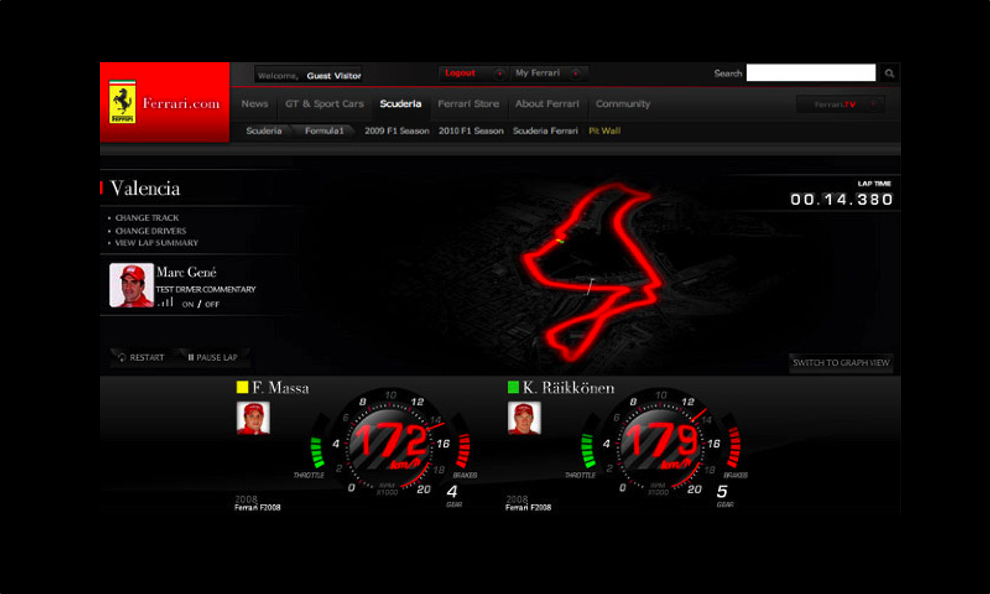Interactive visualization of Ferrari Formula 1 drivers performance on race tracks all over the world using their REAL F1 race data. For Ferrari club members only this experience allowed them geek out on all the stats on speed, G-Force, laps times etc, on numerous race tracks from real Ferrari race data from the actual race season. Select up to 3 drivers choose a track and compare their performance, analyst the data visualization and see who braked the latest or see who is faster in the wet.
