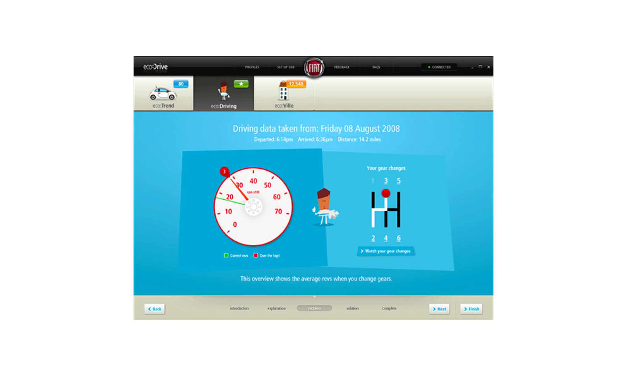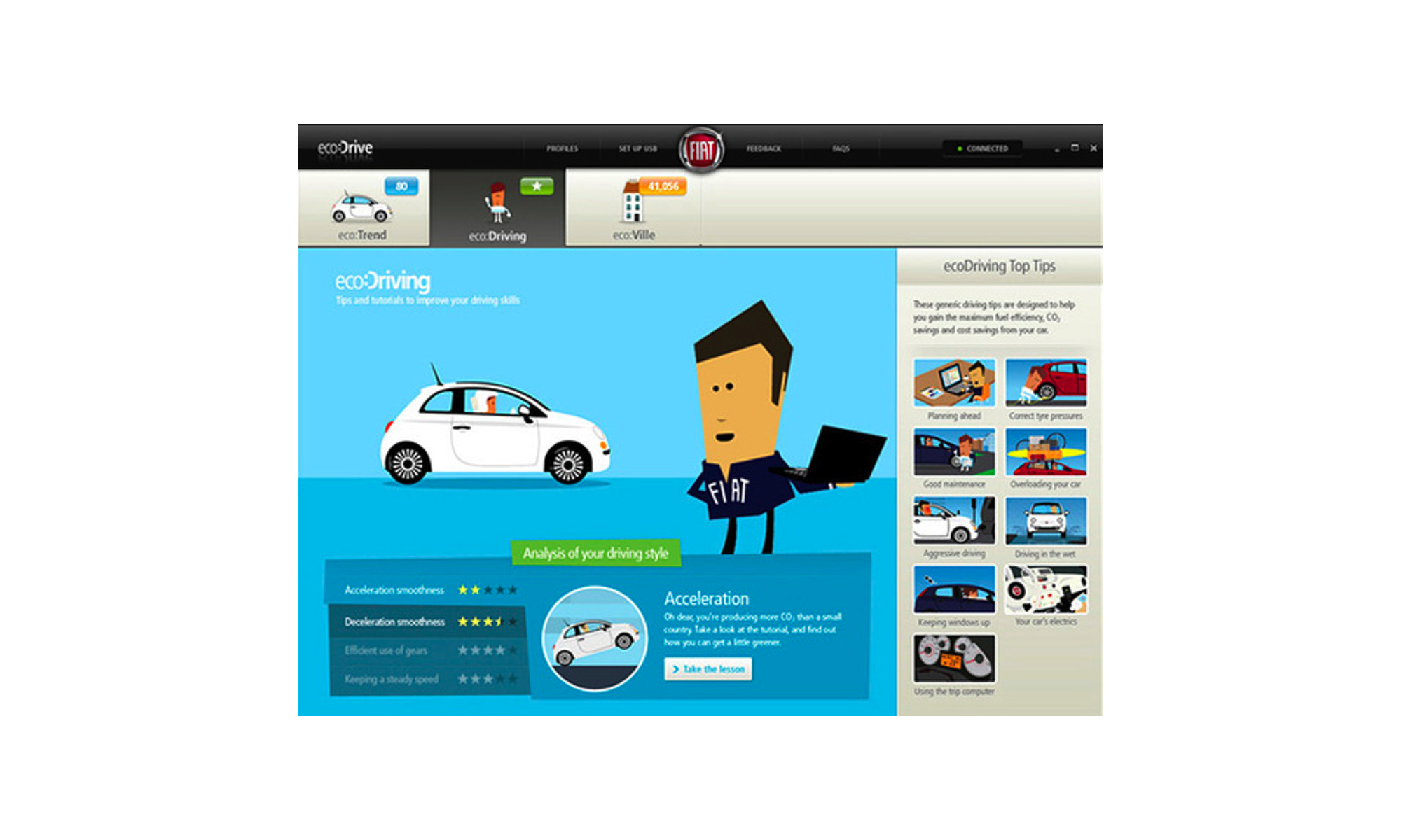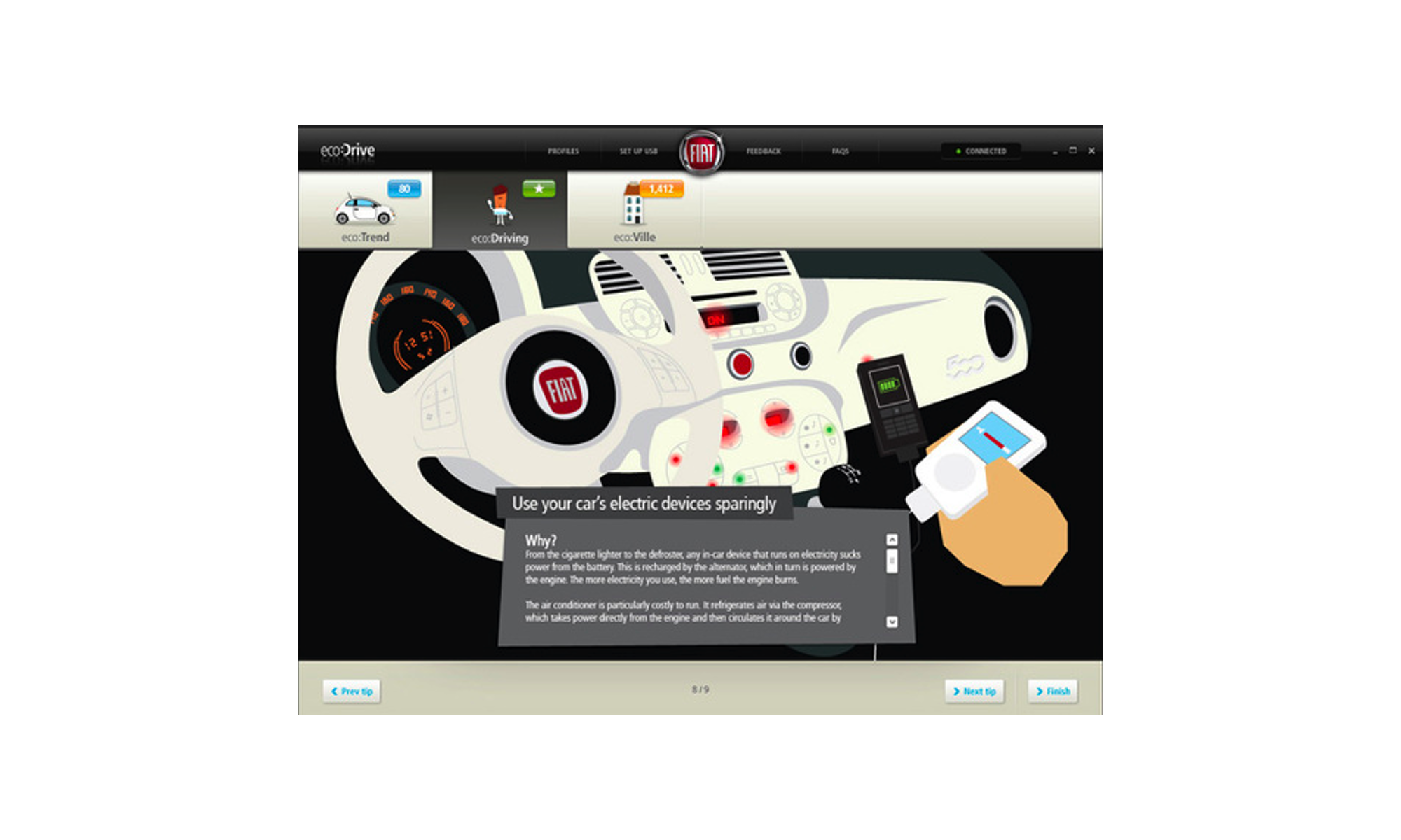 Custom software made for Fiat's in car technology to analyze how consumers drive and suggest driving improvements to improve fuel efficiency and reduce CO2 emissions.