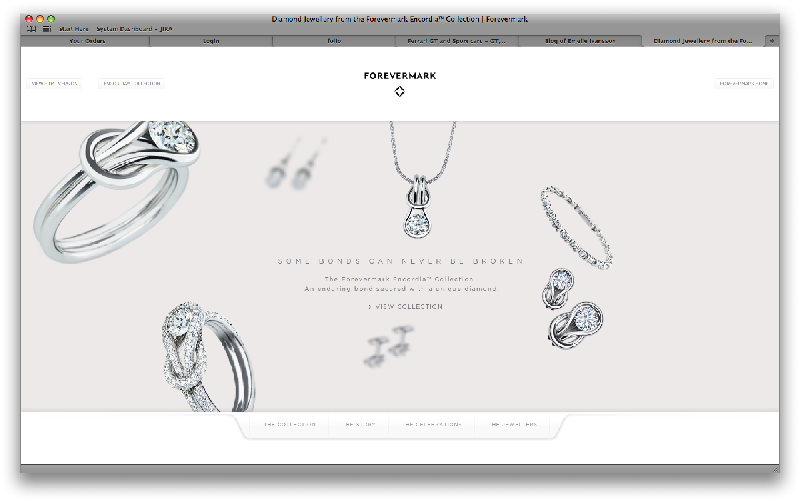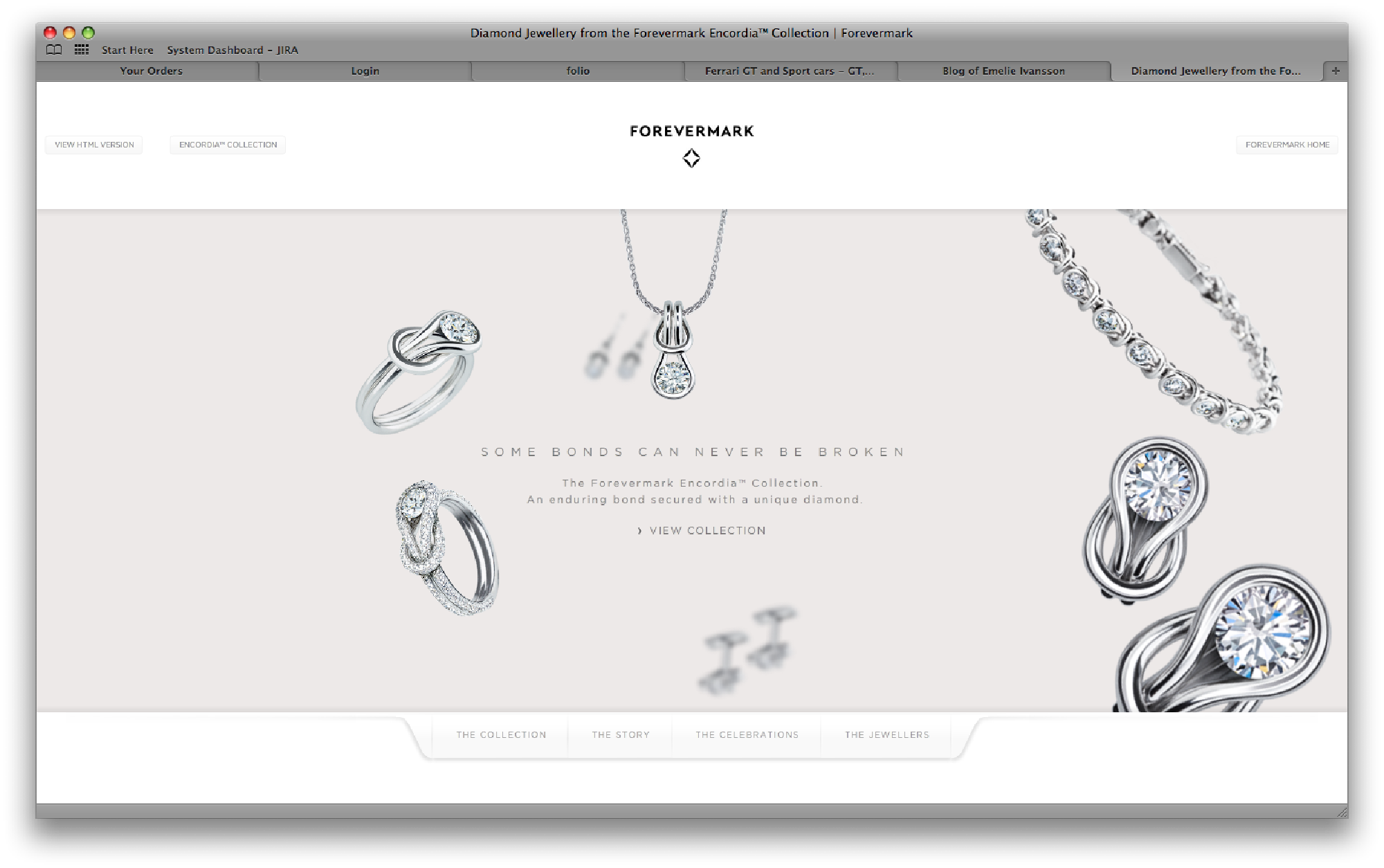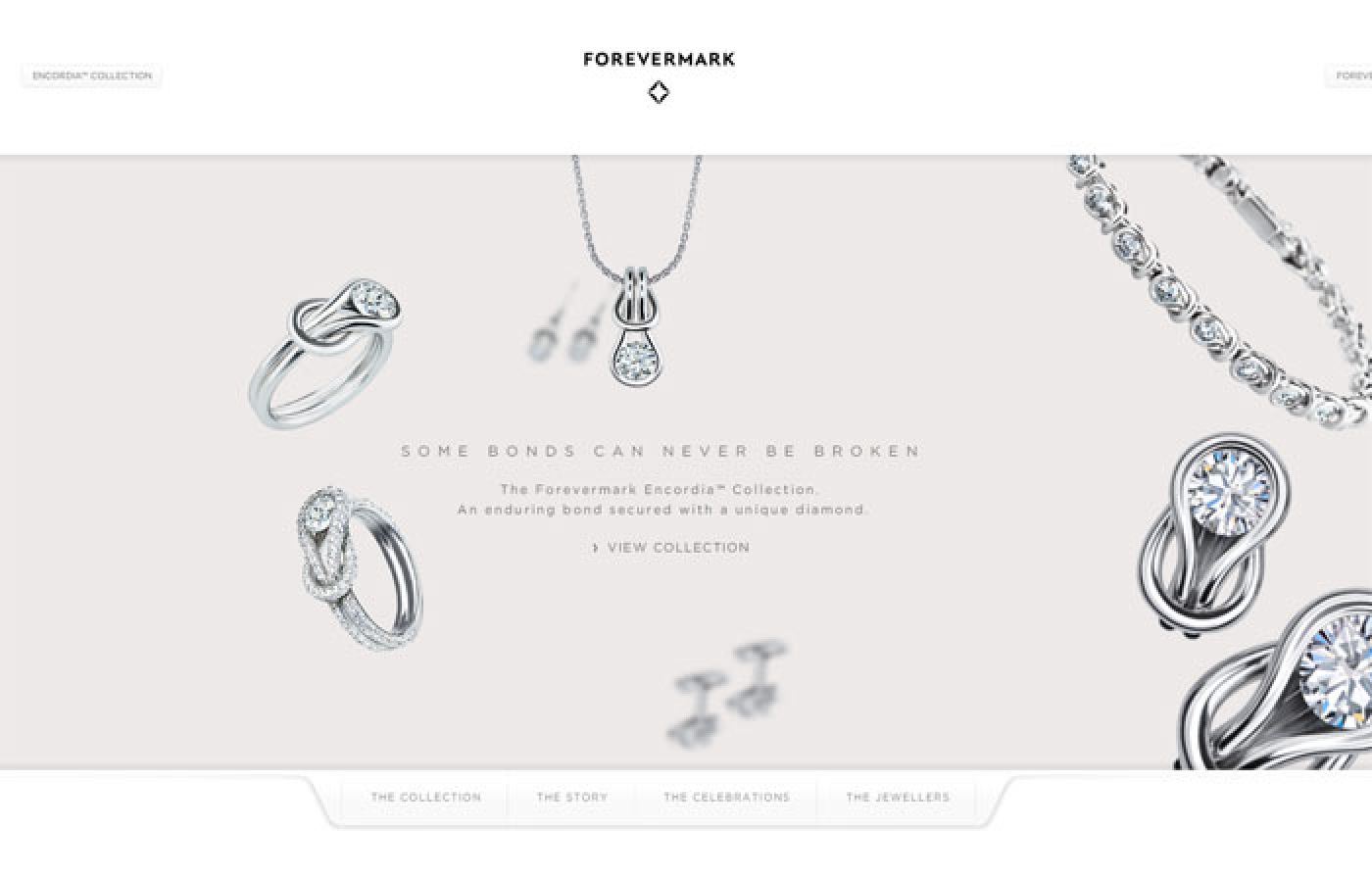 Stylish microsite for DeBeers diamonds to compliment their Forevermark Encordia Collection. Using the most subtle of interactive details to bring out the quality of their products. The centerpiece of the UI was to have the collection floating in an interactive 3D experience. Using dynamic scripted effects to create depth of field as the user interacted with the jewelry rotating the pieces in and out of focus.