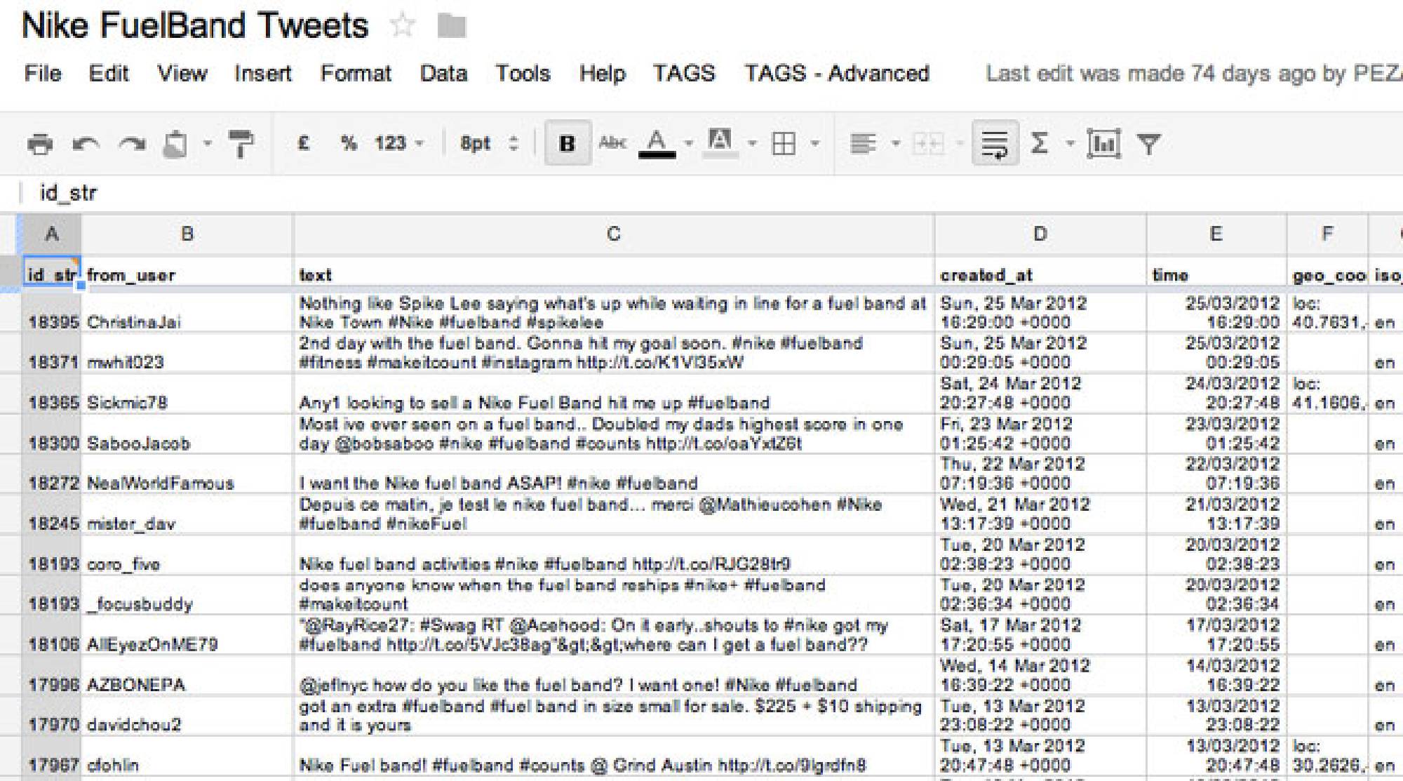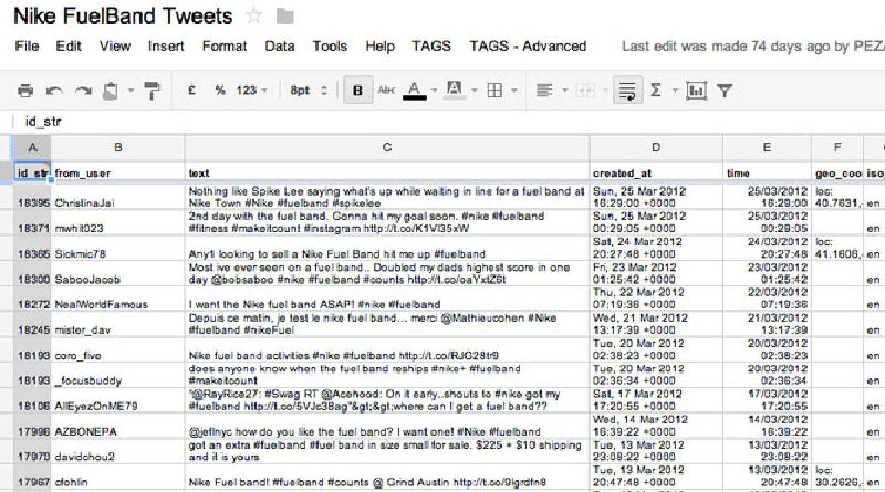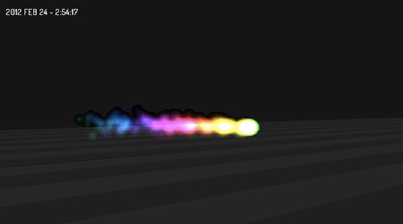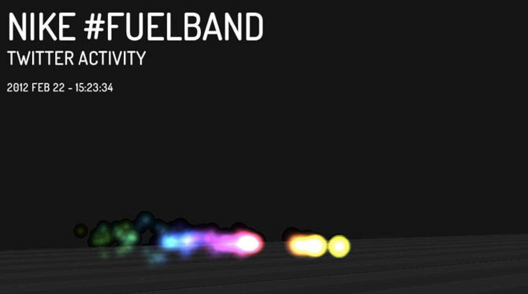WebGL Twitter visualization experiment for Nike #Fuelband launch. Google docs script used for data collection of tweets over long time period. Sentiment engine used to add extra data on pos/neg mood of each tweet. On going experiment to visualize sentiment of tweets by color. Requires WebGL enabled browser.
