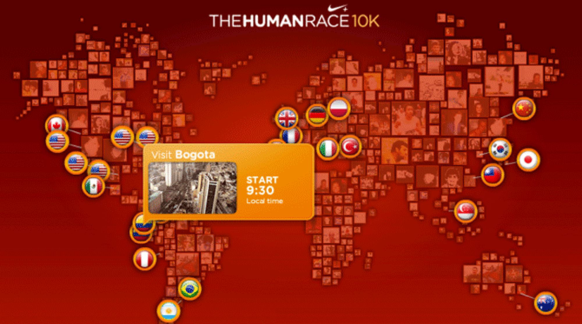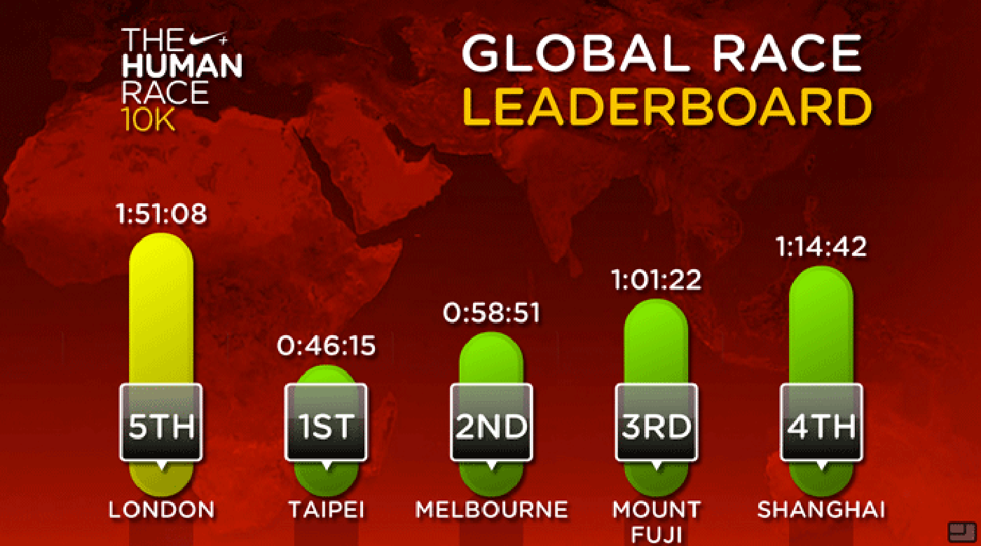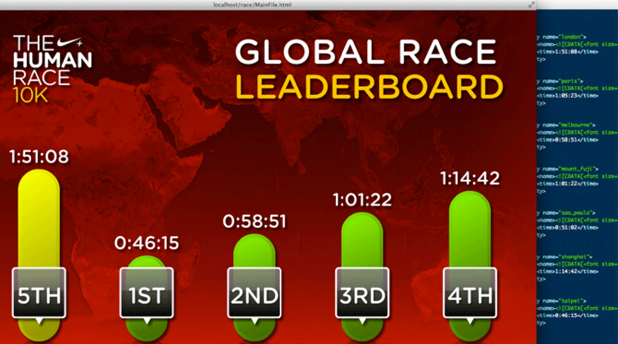 Dynamic leader board for international Nike+ 10k Human Race. Viewed online and on site in London's Wembley Stadium. Using data from races ran simultaneously in cities across the world, to visualize live real time results of average race times to determine the winning city.