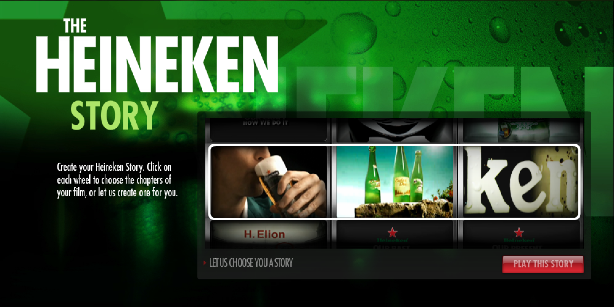 Interactive slot machine style storytellingfor Heineken Beertime Stories advertising campaign. With special footage shot and filmed explaining various historical stages of the brand. The short film footage clips where shot in a way so that any clip could be watched in any order while seamlessly transitioning to the next clip. Spin the slot machine to watch any random combination of three short clips to make a unique dynamic video viewing experience thanks to a clever algorithm.