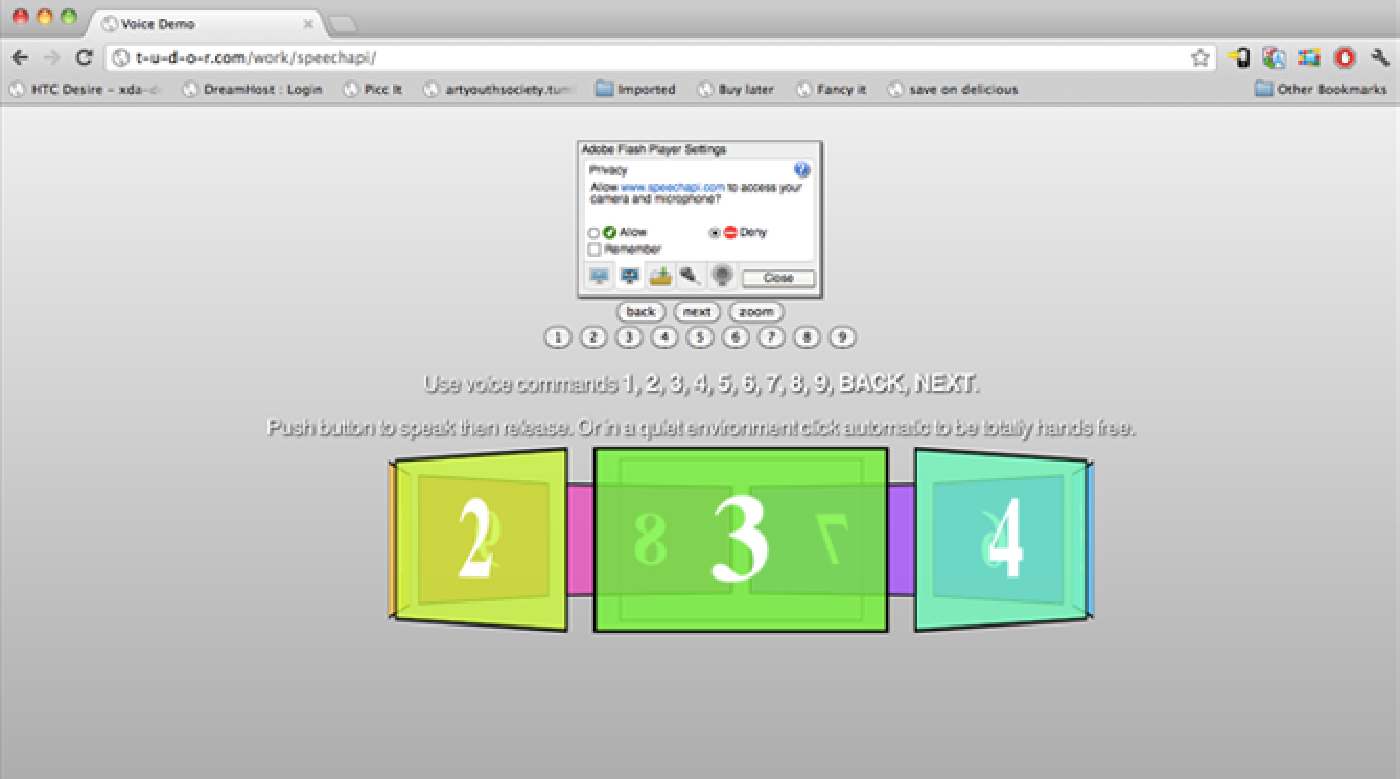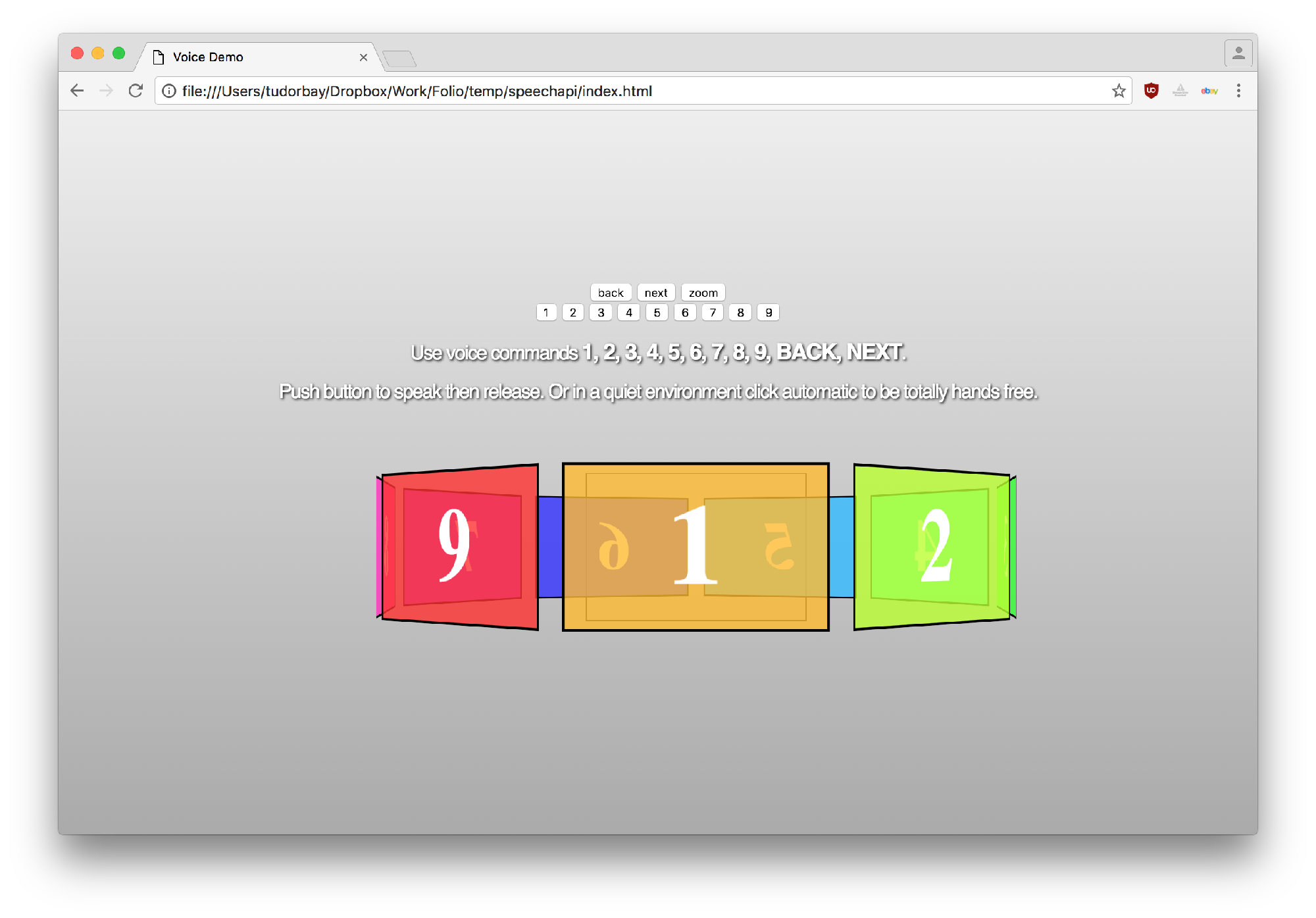 works pretty well in terms of voice recognition, however, a little inconsistent. Until native HTML hardware access is available, Flash is the only way for mic access. CSS 3D transform currently just supported in mozilla and webkit based browsers. User experience can be inhibited by background noise and push to talk mode takes away from hands free experience. Otherwise fun little project and can see a lot of potential in the technology down the line.